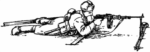 134. Для стрельбы с лыж лежа взять пулемет в правую руку, палки в левую. Оставляя пятки лыж на месте, носки лыж развести в стороны. Поставить пулемет правее себя на сошку (если снег очень глубокий и рыхлый, то прикладом в снег). Опираясь на палки, опуститься на колени;