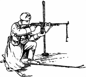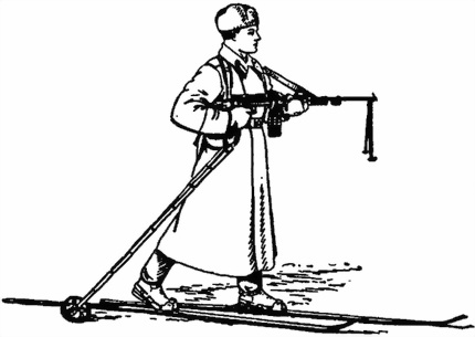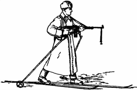 137. Для стрельбы с лыж в движении петли палок надеваются на кисти обеих рук или на кисть одной руки; огонь из пулемета ведется так же, как и на ходу (рис. 59).