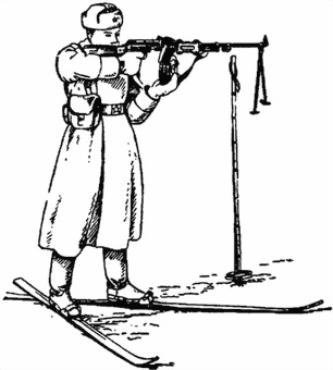 Рис. 58. Стрельба с лыж стоя с использованием палок в качестве упора