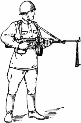 перекидывает ремень через левое плечо и удерживает пулемет правой рукой за пистолетную рукоятку, левой за цевье.