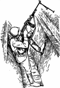 Рис. 64. Стрельба по воздушным целям из траншеи с использованием стенок траншей для опоры спиной и левой ногой