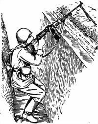 С опорой спиной и левой ногой о крутости траншеи (рис. 64). Приподнять левую ногу как можно выше и упереть ее ступней в переднюю крутость траншеи, а спиной опереться о тыльную крутость траншеи и слегка