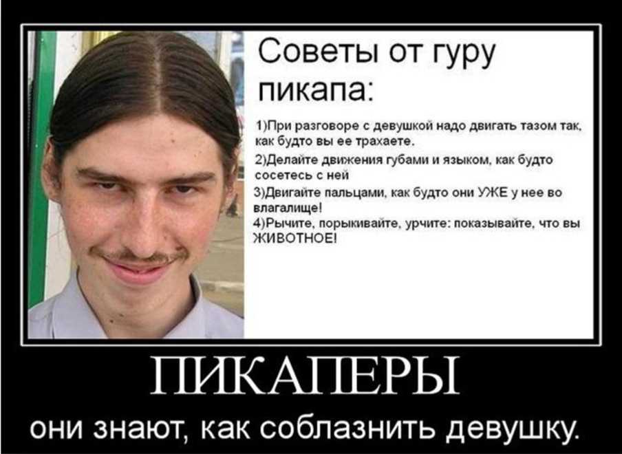 Приходит парень на тренинг и получает кучу информации, какие-то задания (хорошо, если адекватные) и чешет в поля, где его начинают отшивать. А чтобы страшно не было, они перед «полем» могут попрыгать, поводить хоровод, покричать «жопа»: так вроде полегче. Когда мне это рассказывают, у меня смех сквозь слезы, очень уж напоминает сектантские методы. Какие-то «Адвентисты седьмого опенера» и «Свидетели трехсвиданки», в самом деле.Тренинг заканчивается, у двух-трех человек из группы получается знакомиться и приглашать девушку пить кофе. Остальным говорят, что сами виноваты, мало вкалывали и предлагают пройти еще один тренинг и больше подходить. И парни продолжают работать бесплатными клоунами, петь песни в метро, выходить знакомиться в костюме «бомжа» и думать, что выполняют очень развивающие «полевые задания».