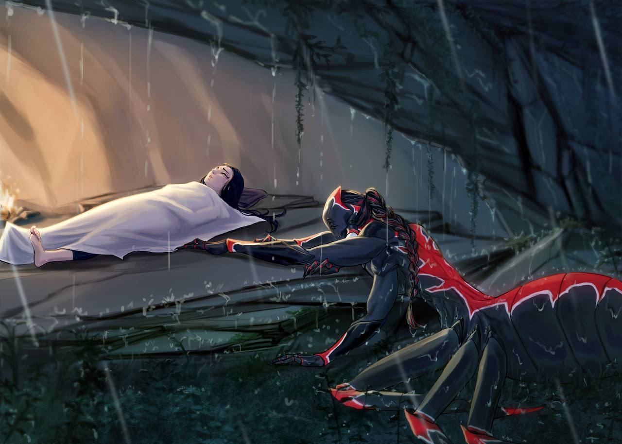 Ахмья крепче сжала пальцы Рекоша и опустила взгляд, изучая твердые, похожие на броню части его торса. Его шкура потемнела там, куда упали капли дождя.