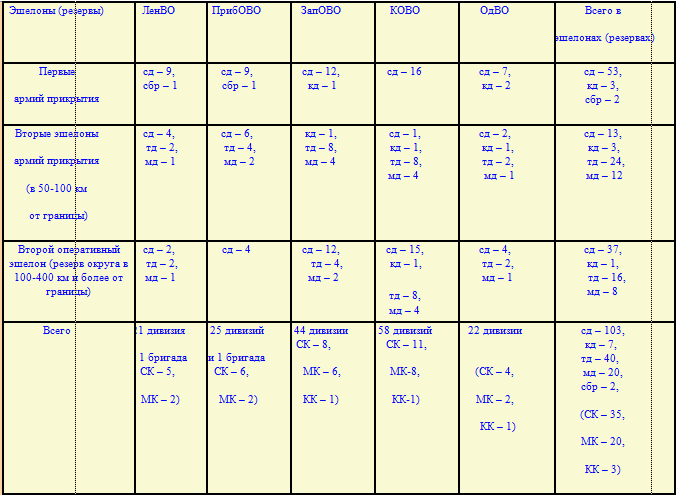 расхождение с "Уроками и выводами": там СД -7, КД 2 (5-я Кав. дивизия дислоцировалась в 120150 км. от пограничной р. Прут, потому и не следовало включать её в число дивизий первого эшелона армий прикрытия по тем критериям, по которым составлена таблица; а дивизии 7-го Особого корпуса ( 156-я СД, 106-я СД, 32-я КД) следовало включить).