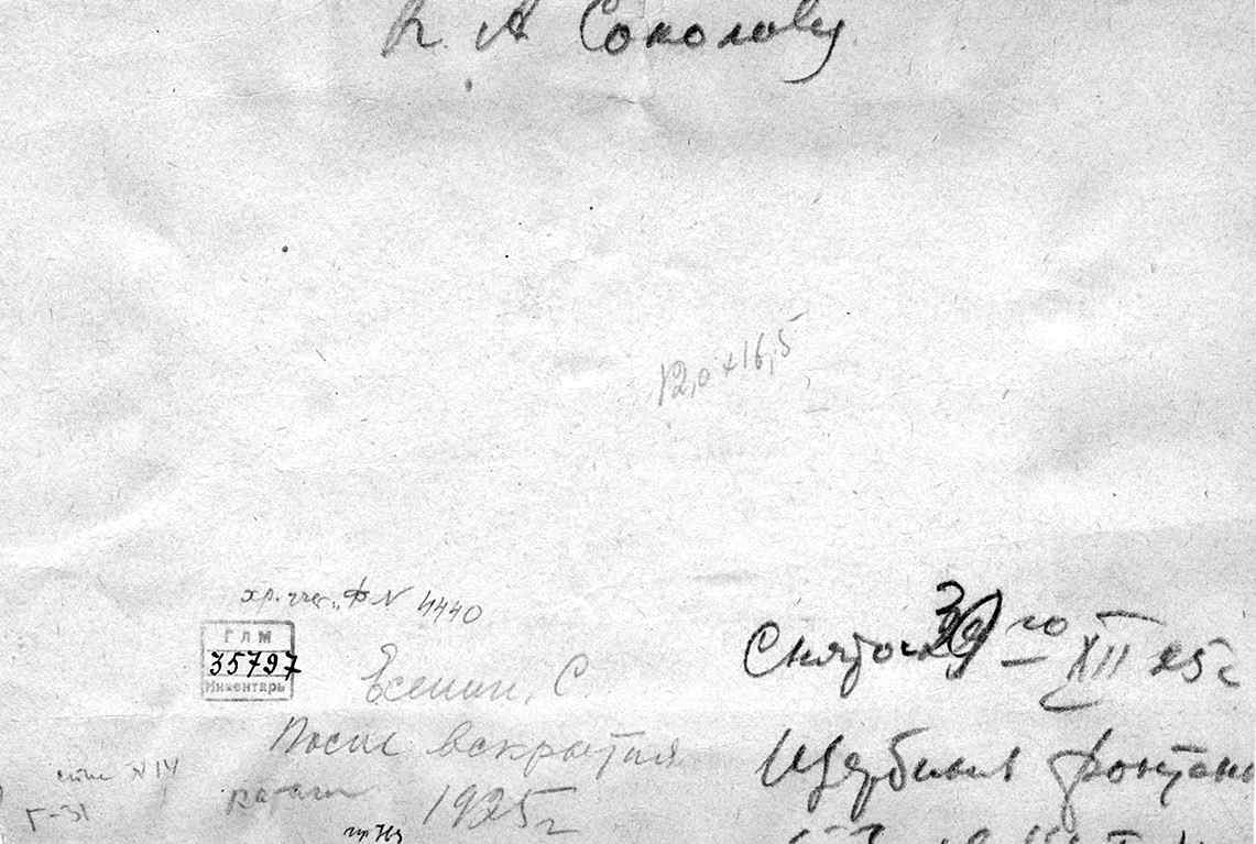 Автор съемки М. С. Наппельбаум. Ленинград, гостиница «Англетер», 28 декабря 1925. Стекло, негатив. 9,0 × 11,8. Получено от I Нотариальной конторы. Собственность бывшего Музея Есенина, 1958