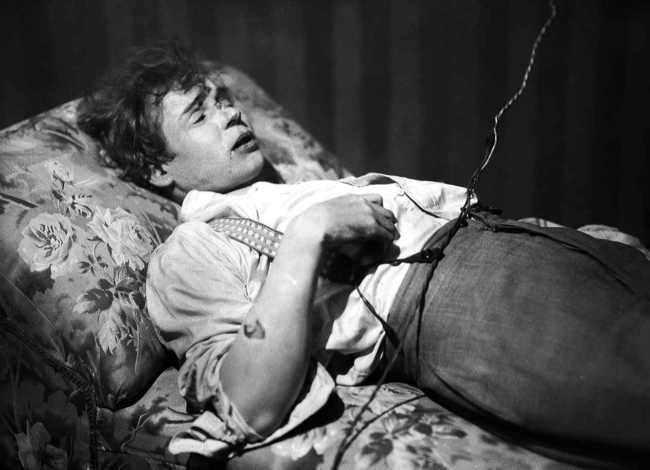 Лежит на кушетке, на спине, голова почти в профиль, правая рука согнута в локте. Фон обои в полоску. В правой части кадра протянут провод.