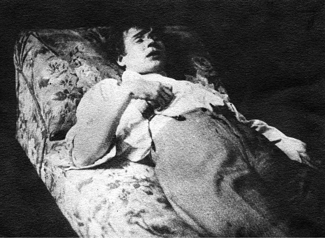 Лежит на кушетке, на спине, голова 3/4 вправо, правая рука согнута в локте.