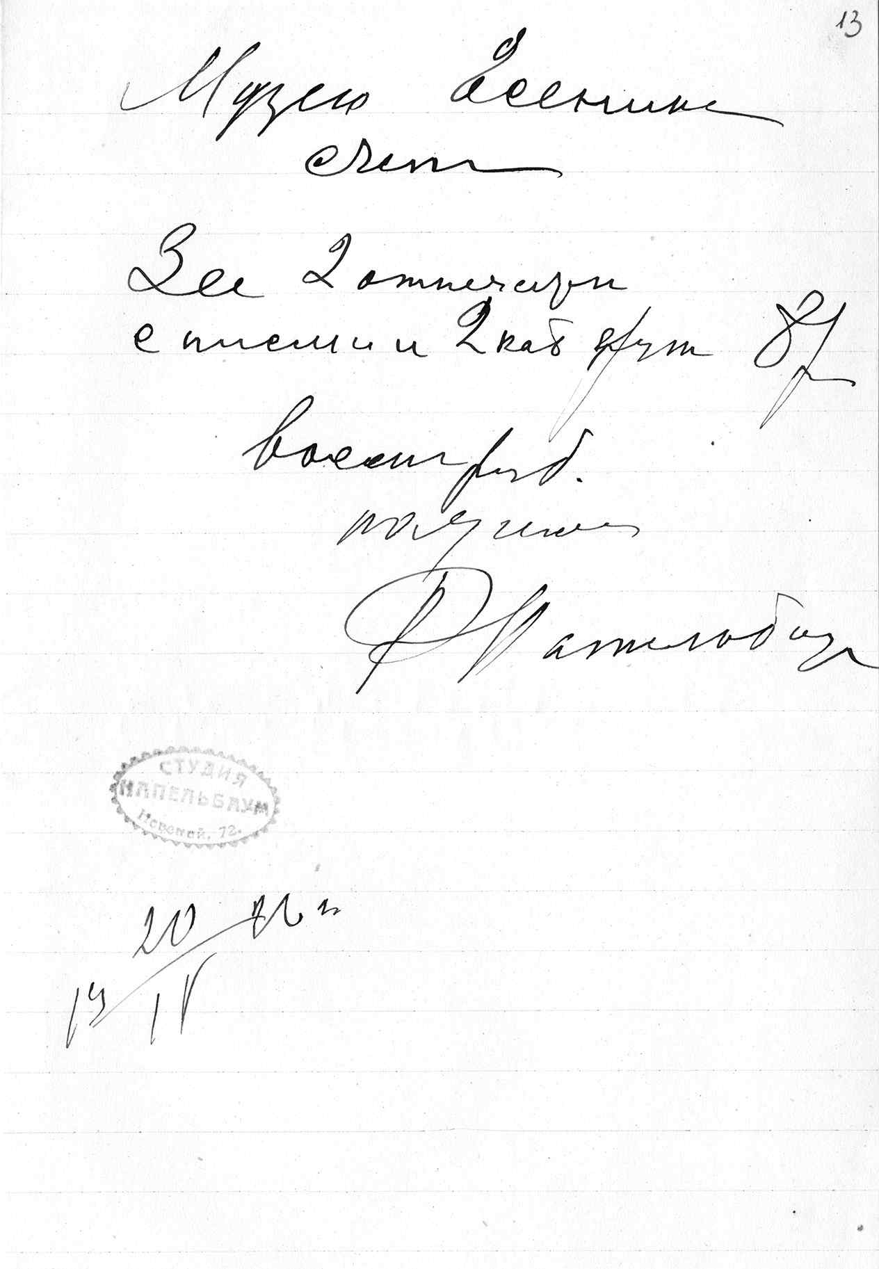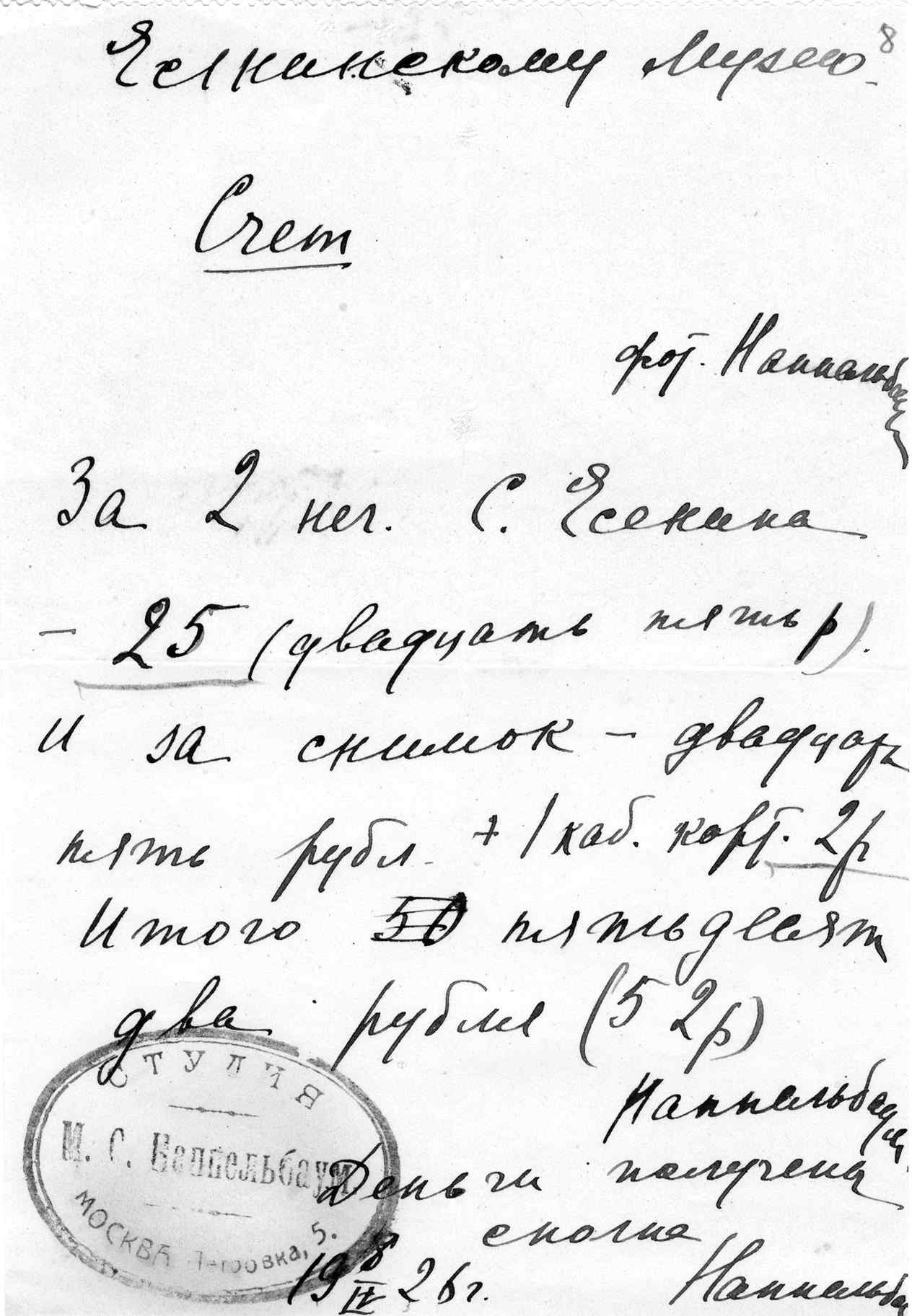 28 декабря 1925 года Наппельбаум был вызван в номер гостиницы «Англетер», где фотографировал тело мертвого Есенина. То, что снимки выполнены фотоателье М. С. Наппельбаума, не подвергается сомнению (в случае коллекции ГЛМ это оригинальные негативы). Собирая коллекцию для музея, Софья Андреевна обратилась к М. С. Наппельбауму с просьбой о получении снимков тела Есенина. В личном архиве Толстой-Есениной хранятся денежные расписки Музею Есенина от студии Наппельбаума в получении денег за выполненные работы . Это счета со штампами: «Студия / М. С. Наппельбаум. / Москва. Петровка, 5» и «Студия / Наппельбаум / Невский, 72». Счет от 8 апреля 1926 включает оплату двух негативов (ил. 17). Счет от 20 апреля 1926 включает оплату снимка «последнего стихотворения» (ил. 18). Счета совпадают с записями на первых страницах Книги расходов Музея Есенина (ил. 1920) .