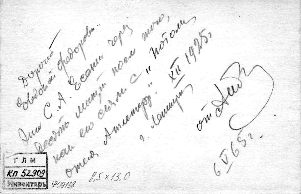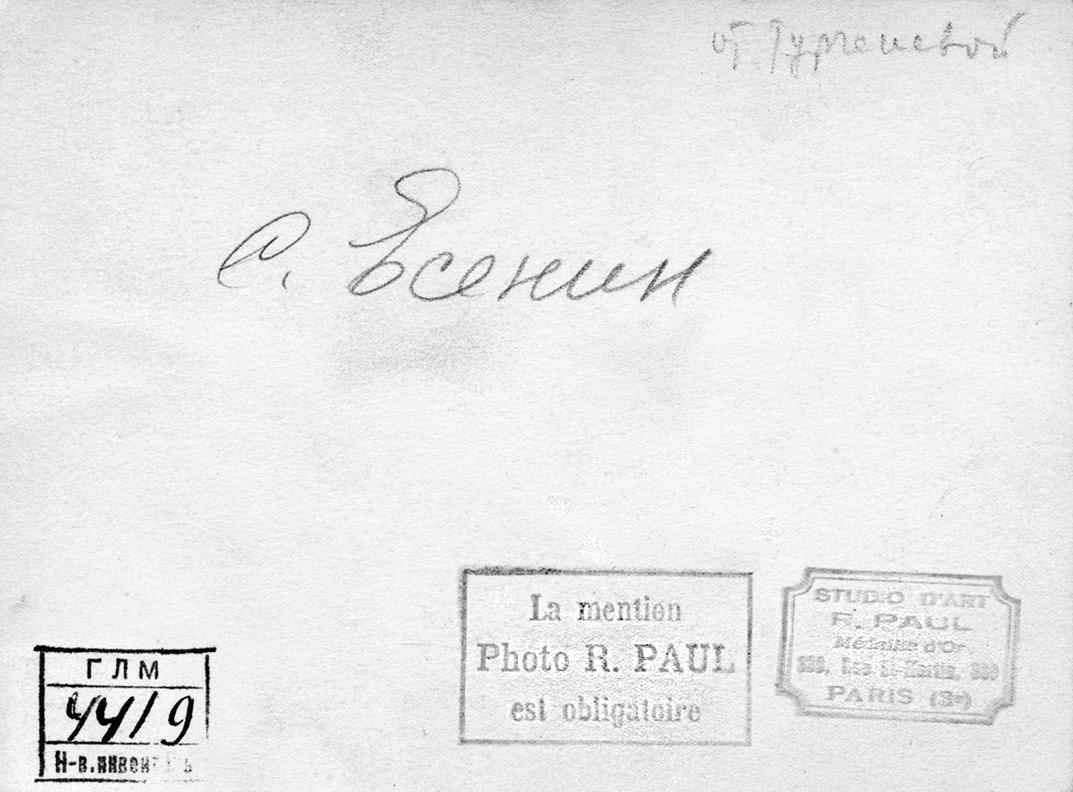 Автор съемки М. С. Наппельбаум. Ленинград, гостиница «Англетер», 28 декабря 1925. На обороте графитовым карандашом: «Дорогой / Евдоксии Федоровне. / Это С. А. Есенин через / десять минут после того, / как его сняли с потолка / отеля Англетер. / XII 1925 г. / г. Ленинград от / 6 V 65 г.».