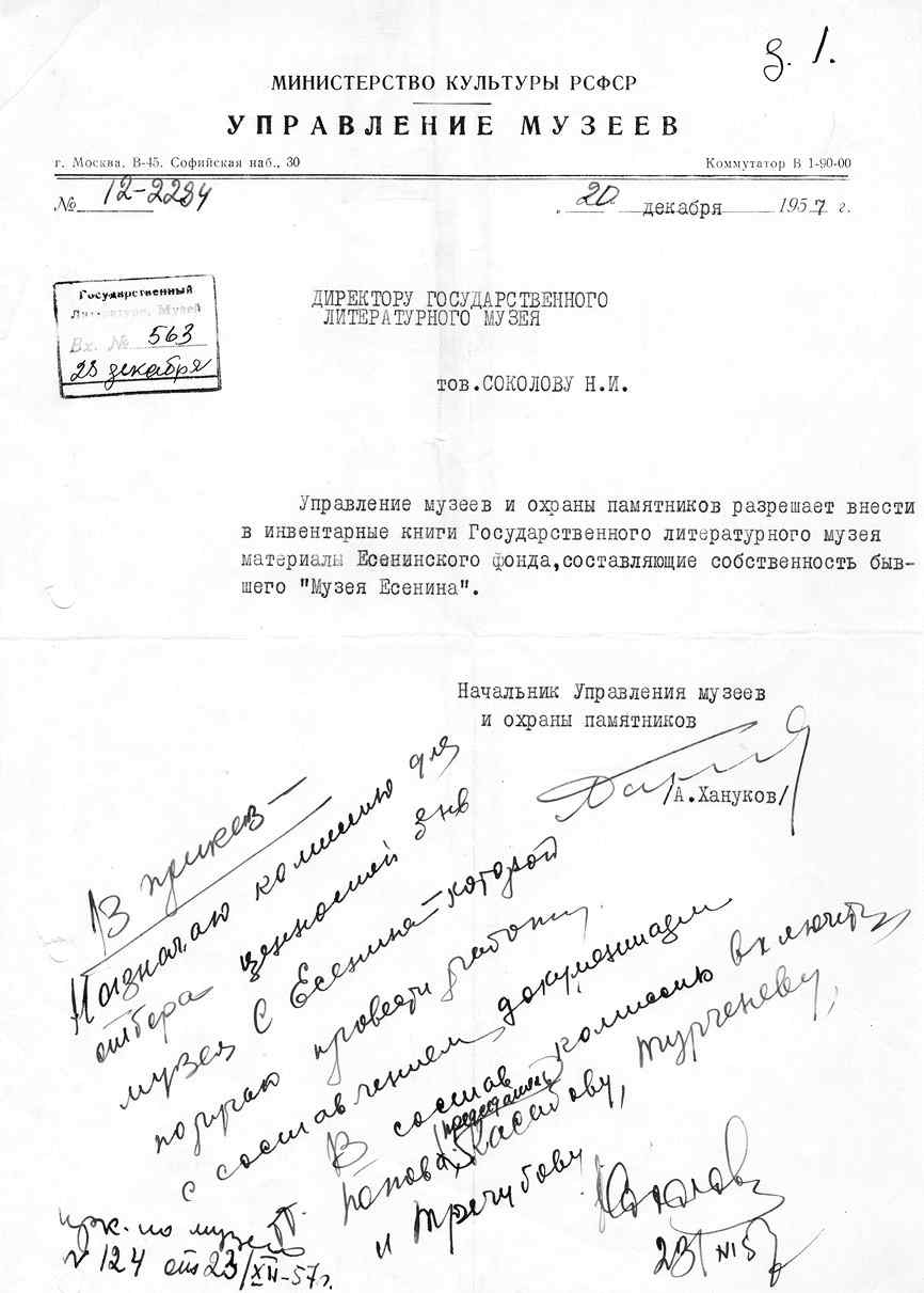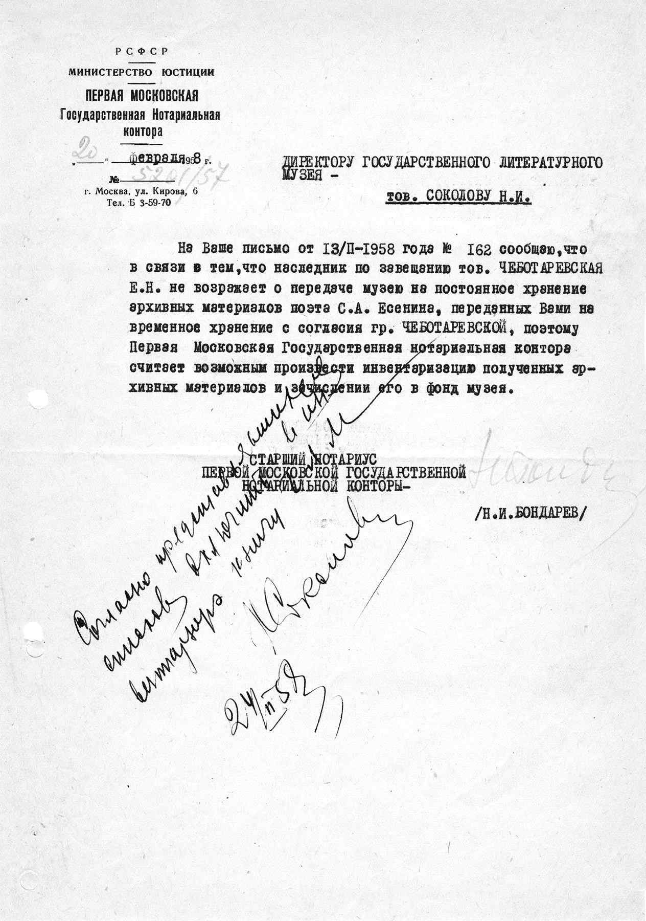 Получено от I Нотариальной конторы. Собственность бывшего Музея Есенина, 1958