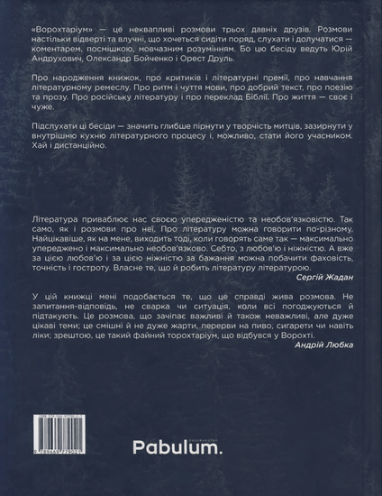 У цій книжці мені подобається те, що це справді жива розмова. Не запитання-відповідь, не сварка чи ситуація, коли всі погоджуються й підтакують. Це розмова, що зачіпає важливі й також неважливі, але дуже цікаві теми; це смішні й не дуже жарти, перерви на пиво, сигарети чи навіть ліки; зрештою, це такий файний торохтаріум, що відбувся у Ворохті.