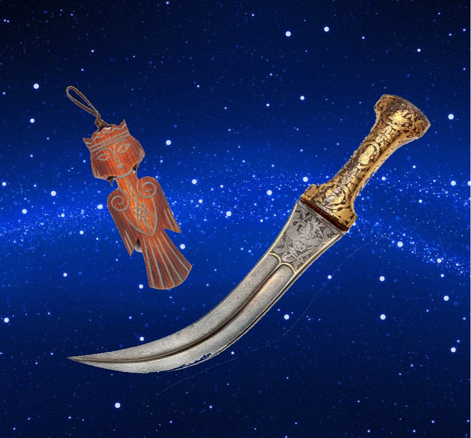 Еще девушка ломала голову над тем, что ей делать со странным кинжалом, который она так и не выпустила из рук. Карина никогда не видела холодного оружия с таким широким загнутым кверху лезвием. Сам кинжал был небольшим сантиметров двадцать пять в длину. Удобная рукоятка была выполнена в характерной восточной форме: тонкая, цельная, с резкими плоскими расширениями с обоих концов, богато украшенная орнаментом. По обеим плоскостям двулезвийнего изогнутого клинка проходило ребро, начиная от рукояти оно плавно переходило в острие, повторяя изгиб кинжала. Не менее причудливыми оказались и ножны, которые Карина обнаружила небрежно брошенными у себя на спальном мешке. Они напоминали Карине крюк, украшенный серебряной сканью с лицевой стороны и гладкой кожей с обратной стороны.