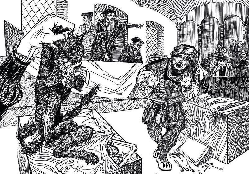 И тут чья-то огромная чёрная лапища, взметнувшись из-под стола, мгновенно скогтила мясо и уволокла его вниз. По-девчоночьи тонко взвизгнув от неожиданности, Амбруаза высоко подпрыгнул и опрокинул на себя поднос с человеческой требухой, стоявший позади него. Из-под стола раздалось громкое чавканье и утробный мяв. Аудитория разразилась громогласным хохотом.