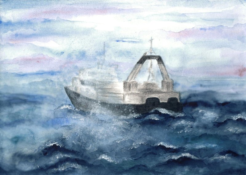 Ближе к вечеру, когда уже совсем стемнело, тоска навалилась на Храннара с такой силой, что его опять потянуло в ближайший бар. Однако вместо этого он вытащил из коробки этюдник, устроился за низким столом не сказать, что это было очень удобно и стал рисовать рыболовный корабль в океане.