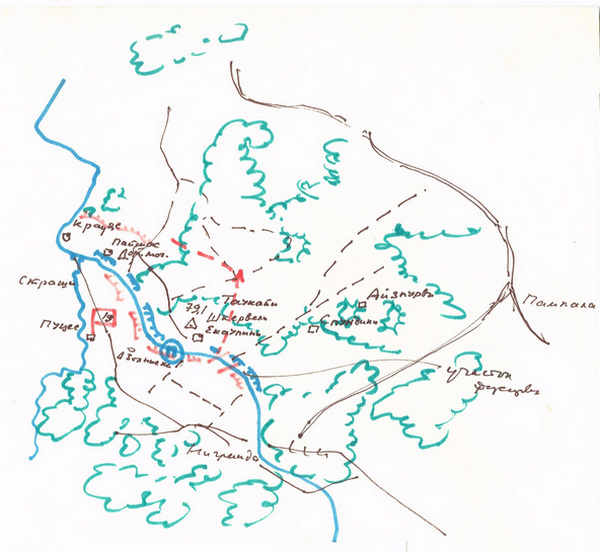 Энтузиазм нашей группы на перекрестке просеки и дороги несколько поостыл. Немцы начинают обходить с фланга. Обмениваемся короткими репликами со старшим лейтенантом командиром фактически сборной полуроты: