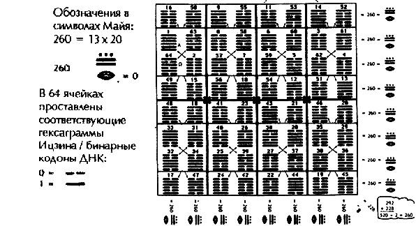 Такое направление мыслей неотвратимо привело меня к работе о теории кодовых матриц - к книге «Земля Восходящая» . Я начинал писать ее как труд о геомантии «гадании по Земле», и основой содержания книги было удивительное «совпадение», обнаруженное или, во всяком случае, развитое как научно-философская теория Мартином Шонбергером - тождественное соответствие 64 гексаграмм Ицзина и 64 кодонов , ключевых блоков ДНК, генетического кода. Одновременно я совершил свое собственное открытие, обнаружив, что каждый вертикальный и горизонтальный ряд «волшебной шахматной доски Бенджамина Франклина» дает в сумме число 260 - и это повергло меня в размышления о связи матрицы Священного Календаря Майя, Цолькина , состоящего из 260 ячеек, и Ицзина . Результатом явилось неожиданное множество «карт», рисунков различных матриц, приведенных в «Земле Восходящей », а ключевой фигурой, связующей их, стала «конфигурация бинарного триплета», на которой основан Священный Календарь Майя.
