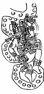 Вторая скульптура вырезана на не менее монументальном каменном алтаре «Зооморф П» там же, в Киригуа. Лишь ступни и нижняя часть ног этого существа могут быть с уверенностью опознаны как человеческие - вся остальная сидящая фигура полностью теряется в лабиринте странных, но пропорциональных орнаментальных структур. Из центра алтаря «Зооморф П» на нас смотрит лицо сидящей фигуры, застывшей в созерцании, со скипетром в руке. Все изображения Киригуа изобилуют множеством иероглифических надписей. Композиция, украшающая крышку саркофага в Паленке, сопровождается описанием Девяти Властелинов Времени, или Девяти Владык Подземных Миров. Как они связаны с саркофагом? Не являются ли они символами прихода или, наоборот, возвращения в вибрирующее поле Кушан Суум ?