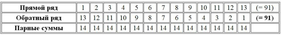 Суммы членов прямого и обратного ряда равны и составляют 1+2+3+4+...+13 = 91 , и эту сумму можно представить в виде: 91 = 13 ×7 .
