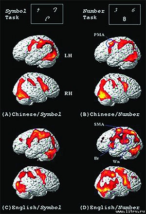 В экспериментах, проведенных под руководством Июаня Тана (Yiyuan Tang) в Даляне, люди, для которых родным языком был английский или китайский, складывали одинаковые числа (написанные арабскими цифрами). Некоторые участки мозга в равной степени активировались у всех испытуемых. Но у «англоговорящих» дополнительно возбуждался участок мозга, связанный с восприятием речи, а коренные китайцы воспринимали информацию как чисто зрительную. Возможно, это связано с тем, что на математические операции переносились особенности языков, видимо, работа с иероглифами ближе к образному, художественному восприятию, задействующему зрительный анализатор. Могло сказаться и различие традиционных способов обучения. И как тут не отметить известное мнение, что философия Запада больше тяготеет к вербально-логическому, а философия Востока к целостному, образному способу представления мира. Тан считает, что изучение различий в способах оперирования математическими величинами в разных культурах способно помочь в разработке оптимальных вычислительных стратегий.