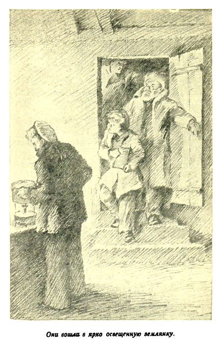 Ноги у Павки затекли и онемели. Он с трудом заковылял за Косоротом. Косорот подошел к засыпанной снегом землянке, толкнул какую-то почерневшую доску. Это был вход. Он пропустил вперед профессора.
