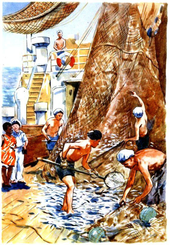 Кроме сардины, в трале попадались другие породы рыб самых причудливых форм и расцветок: огромные раки лангусты, осьминоги, каракатицы, брызгающие чернильной жидкостью, морские звезды и ежи. Все это двигалось, сверкало чешуей и панцирями, переливалось на солнце.