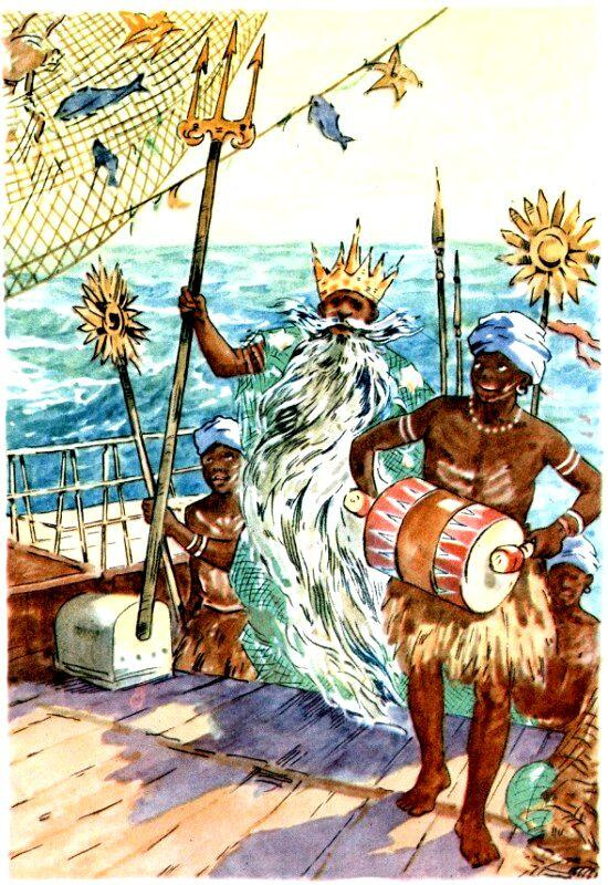 - Добро! - ответил Нептун. - Советских моряков знаю. Храбрые и трудолюбивые люди. Да и страна ваша достойная. Пример для всех остальных. С радостью открываю вам путь через экватор. Плывите, куда пожелаете. Пользуйтесь моими несметными подводными сокровищами на благо советских людей. Только кто раньше не был в этих местах, должен принять соленую купель!