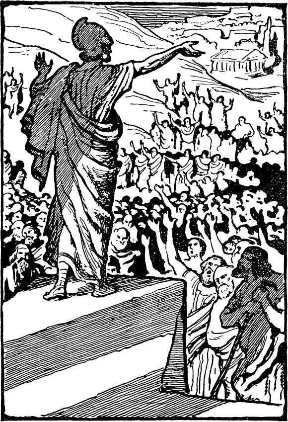 Глаза вождя демоса были задумчивы и грустны. Он не смотрел на окружавших его людей. Хорошо сложенный, стройный, невысокого роста, Первый Стратег Афин легко поднялся на камень ораторов. Теперь он стоял на виду у всех, уверенный и спокойный.