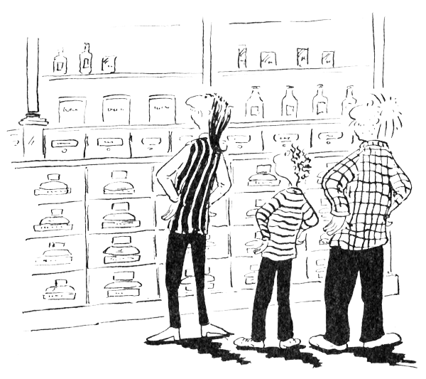 В аптеке дядя Астор зашёл за прилавок и постоял там, уставившись на огромный аптечный шкаф во всю стену он наполовину состоял из полированных выдвижных ящиков вишнёвого дерева. Этот шкаф я видел чуть ли не каждый день, но теперь смотрел на него, так сказать, глазами дяди Астора и пытался понять, что он выискивает. В основании четыре ряда ящиков, один над другим. В каждом ряду по семь ящиков. Всего получалось двадцать восемь, тут я впервые их сосчитал. А над ними открытые полки, заставленные фарфоровыми банками.