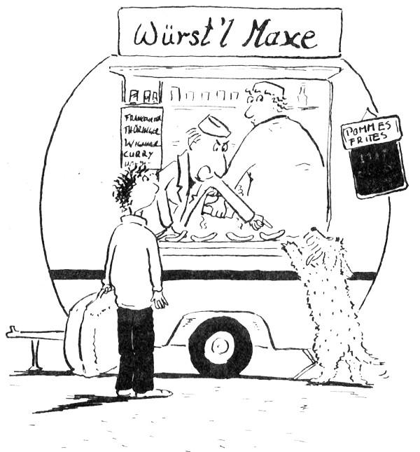 По краю большой площади мы проходили мимо будки с жареными сосисками. Проходили, да так и не прошли. Белло просто не мог оторваться от будки-вагончика, он встал на задние лапы, положил передние на прилавок и жадно уставился на сосиски, которые жарились на решётке.