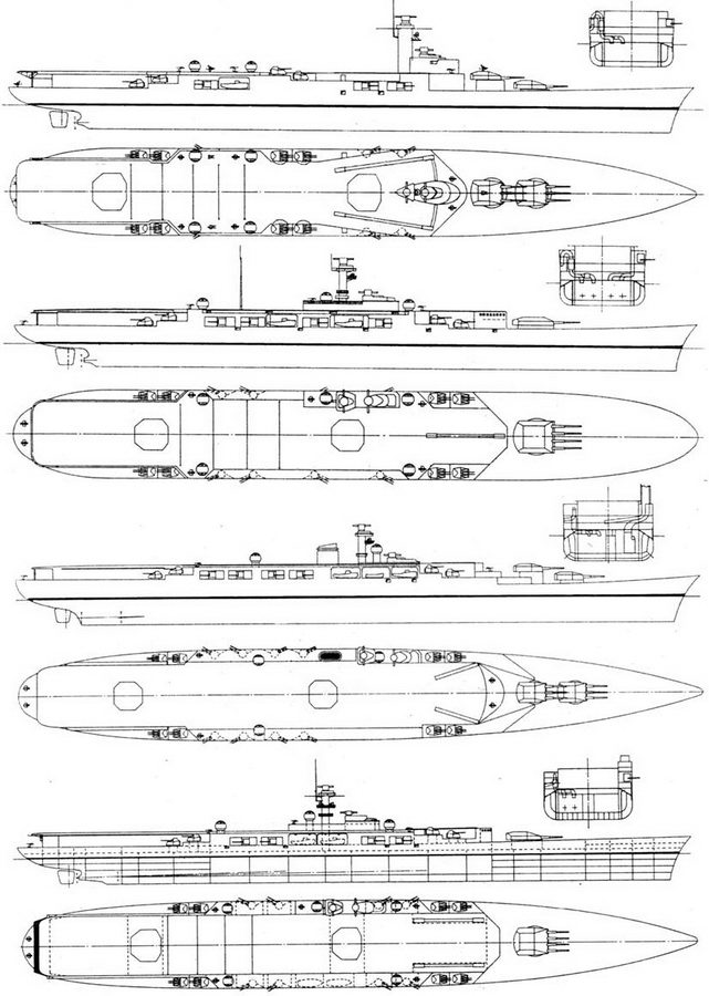 калибра в четырехорудийных башнях. В отличие от "Графа Цеппелин", наличие 150-мм артиллерии здесь не кажется излишней на карманных линкорах они сослужили хорошую службу. Конечно, даже в качестве рейдеров представленные проекты не были лишены достаточно очевидных недостатков. Например, расположение надстройки в проекте "А Па" напоминает таковое у британского "Фьюрес" 1918 года. Как мы помним, именно вызванное надстройкой мощное возмущение воздушного потока явилось причиной безуспешных попыток самолетов сесть на его палубу. Кроме этого, в те времена авианосец для взлета самолетов с катапульты всегда должен был приводить направление старта строго к ветру. При массовом подъеме авиации (каждая катапульта один раз в минуту, т. е. два старта в минуту) корабль должен был бы маневрировать как при слаломе, причем способность столь большого корабля ложиться на новый курс через каждые 30 секунд вызывает сомнение. К проекту "А III" те же вопросы по катапультам, тем более что этот корабль значительно больше "А Па".