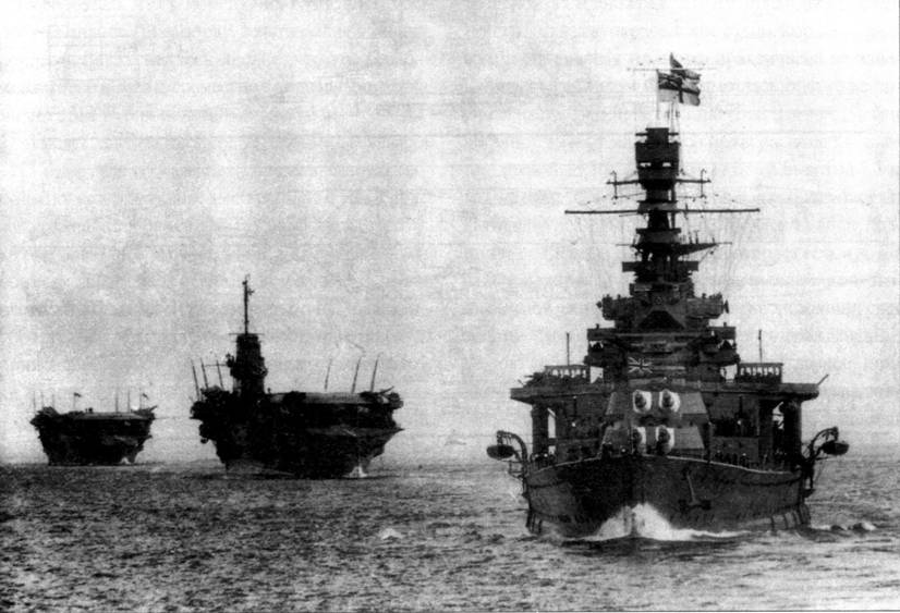 Маневры британского флота в 1935 году. На переднем плане линейный крейсер "Ринаун", за ним авианосцы "Корейджес" и "Фьюриес"