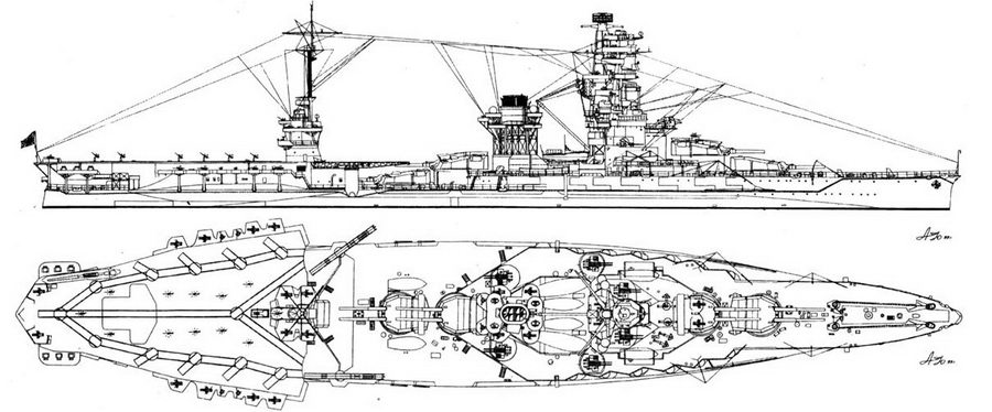 Еще до начала войны на Тихом океане считался устаревшим линкором, что и послужило поводом для переоборудования его в гидроавианосец. Модернизация проходила по знакомой уже схеме, отработанной на крейсере "Могами". но имелись и принципиальные от.лич)1я. Во-первых, корабль получил две новых катапульты вместо одной старой, размещенной на юте. Во-вторых, под площадкой для гидросамолетов оборудовав ангар с лифтом, что качественно улучшило условия эксплуатации авиации. Несмотря на то, что линкору сохранили среднюю группу главного калибра, возможности ее применения были крайне ограничены по секторам обстрела из-за пагубного влияния дульных газов на авиационное оборудование.