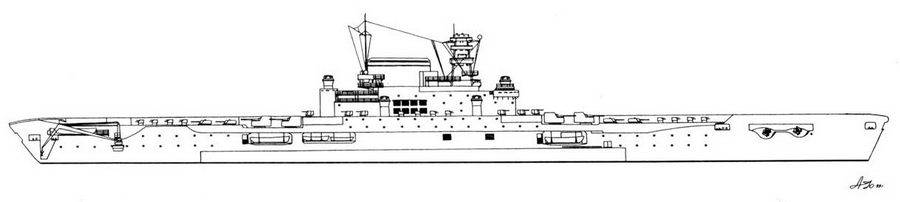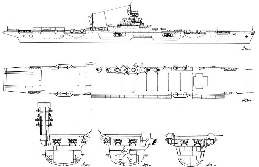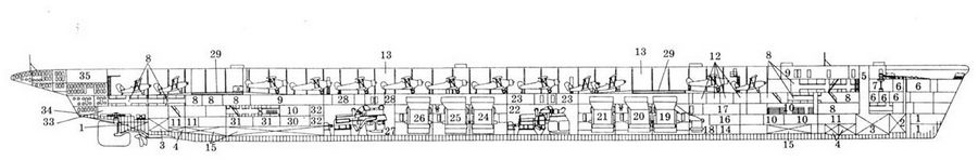 1. Дифферентный отсек. 2. Цепной ящик. 3- Цистерны авиационного топлива. 4. Цистерны пресной воды. 5. Шахта вентиляции цистерны авиационного топлива. 6. Бытовые помещения экипажа. 7. Помещение шпилевых машин. 8. Кубрики личного состава. 9- Коридор. 10. Погреба авиационного боезапаса. 11. Кладовая сухой провизии. 12. Медицинский блок. 13- Ангар. 14. Помещение гирокомпаса. 15. Топливные цистерны. 16. Центральный артиллерийский пост. 17. Помещение вспомогательных механизмов. 18. Вспомогательный котел. 19 21, 24 26. Главные котлы. 22. Носовое машинное отделение. 23. Камбуз. 27. Кормовое машинное отделение. 28. Механические мастерские. 29. Подъемная площадка лифта. 30. Помещения вспомогательных механизмов. 31. Провизионные кладовые. 32. Помещения рефрижераторных машин. 33. Румпельное отделение. 34. Химическая кладовая. 35. Помещения летного состава.