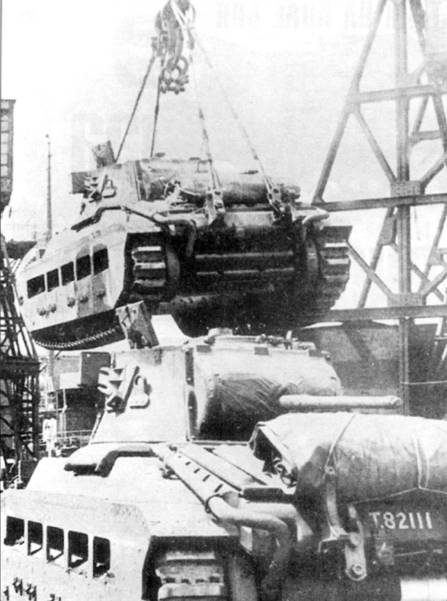 Погрузка танка «Матильда II» па судно, плывущее в СССР, 1942 год.
