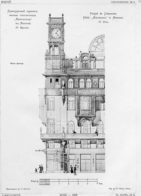 Вильям Валькот, родившийся в Одессе в русско-шотландской семье, некоторое время учился в знаменитой Ришельевской гимназии, потом вместе с родителями уехал в Южную Африку, но в возрасте 17 лет вернулся в Россию, чтобы поступить в Императорскую академию художеств. Бывал он и в Москве и, поскольку был знаком с сыном Мамонтова Андреем, посещал также и Абрамцево, где заинтересовался майоликой. Осваивая технологию, он провёл много времени в мастерской и сделал несколько эскизов, поскольку рисовать всегда любил, очевидно, тогда же Валькот и узнал о проводимом конкурсе. В своём проекте он обозначил на фасаде место, где могло бы разместиться мозаичное или майоликовое панно, и эту идею Мамонтов принял с восторгом. Нет, не одно панно, пусть их будет несколько! А центральной композицией мы сделаем «Принцессу Грёзу», ведь повторить в технике майолики врубелевский шедевр нашим мастерам вполне по силам!.. Савва Иванович не только сам воодушевился открывшейся возможностью, но и владельцев будущей гостиницы этим увлёк. В итоге решили «строить по проекту, удостоенному первой премии, с добавлением к нему всего лучшего и оригинального из других премированных проектов».