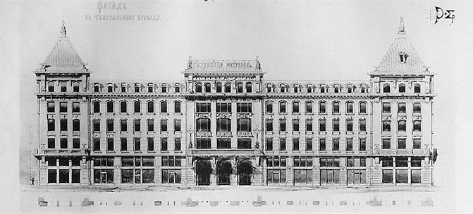 1-я премия. Проект Л. Н. Кекушева, С. С. Шуцмана, Н. Л. Шевякова и В. В. Воейкова. Фасад со стороны Театральной площади