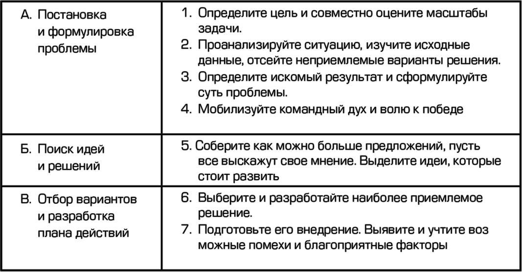решение нужно успешно воплотить в жизнь, оценить результаты и закрепить их.
