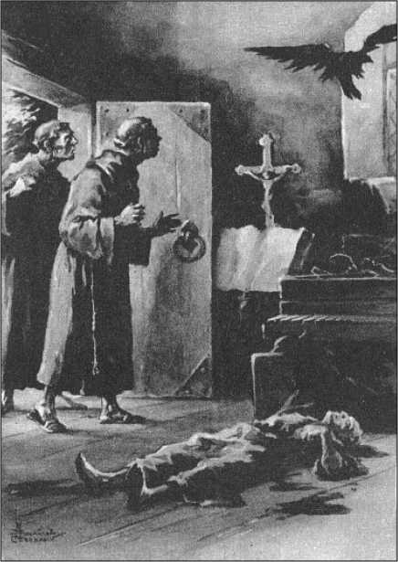 Через несколько минут монахи вошли в келью к брату Франческо. Прежде всего им бросилось в глаза следующее странное явление: едва они вошли сюда, как с длинного странного ящика вспорхнула и быстро вылетела в окно черная птица. И бесследно исчезла за окном, испустив щемящий и скорбный вопль.