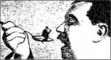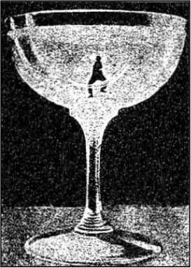Заинтересовавшись грандиозным сооружением из чистого стекла, возвышавшимся на столе и оказавшимся бокалом, из которого пьют шампанское, я взобрался на самый верх его, с трудом удерживаясь на скользкой поверхности его ободка. Вдруг где-то открылась дверь, дунул ветерок и я, к ужасу своему, полетел кубарем вниз. Проклятие! бокал был наполнен водой. Я стал тонуть И, наверное, погиб бы, если бы мне не пришла в голову блестящая идея: я решил выпить воду, наполнявшую бокал. По мере того, как я пропускал в себя глоток за глотком, вода в бокале все убывала и убывала, а мое раздувшееся тело поднималось все выше и выше к поверхности.
