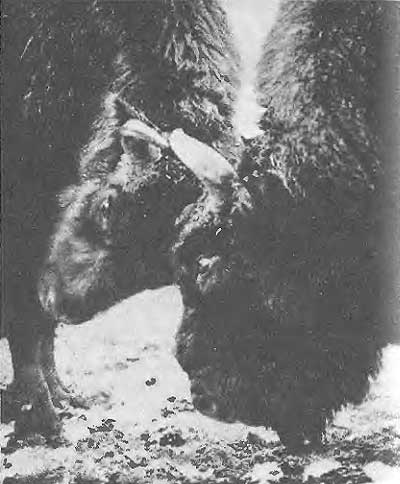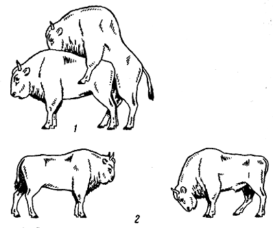 Демонстрация вспрыгивания (рис. 5, 1 ) утверждение или подтверждение доминантного положения. Зубр вскакивает и ложится всей передней частью тела на спину другой особи, причем половые отношения здесь исключены. Если подчиненное животное смирилось со своим положением, то оно стоит в позе покорности, спокойно опустив голову к земле. Вспрыгнувший зубр остается в таком положении несколько секунд, затем медленно сползает и либо уходит, либо остается рядом с подчинившимся зверем. Если же последний не согласен с отведенной ему ролью, то он либо убегает, либо разворачивается, защищая свое достоинство в схватке, либо пытается вспрыгнуть сам на зверя, претендующего на роль доминанта.