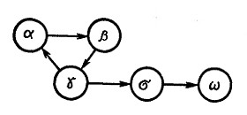 Рис. 7. Иерархические отношения самок в ЦЗП в 1977 году (в скобках годы рождения животных): α Можжевеловка (1963); β Моста (1960); γ Плумпа (1972); σ Московка (1956); ω Мостинка (1973)