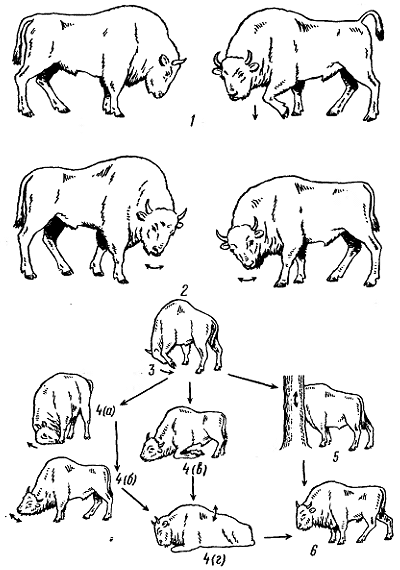 Рис. 12. Поведенческие акты, составляющие ритуал предупреждения (стрелками изображены направления движения головы и ног животного): 1 нерешительная прогулка; 2 угрожающее противостояние; 3 копытенье; 4 валяние (а взрыхление земли рогами, б разметывание земли бородой в положении стоя, в то же в положении припав на колени, г непосредственно валяние на боку); 5 чесание; 6 исходное положение