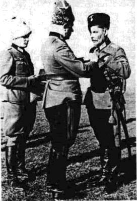 Командир 1-й казачьей дивизии Вермахта генерал-майор Вермахта X. фон Паннвиц награждает Железным крестом 2-го класса командира 5-го Донского полка 2-й Кавказской бригады дивизии подполковника Вермахта И.Н. Кононова, 1944 г. (предположительно)