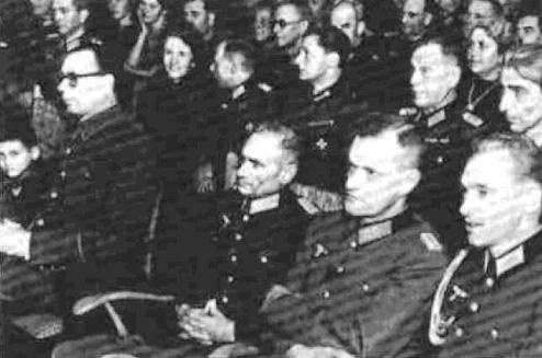 Справа налево: оперативный адъютант генерал-лейтенанта А.А. Власова, начальник командного отдела штаба Вооруженных Сил КОНР, полковник ВС КОНР В.В. Поздняков, начальник штаба Вооруженных Сил КОНР генерал-майор ВС КОНР Ф.И. Трухин, начальник артиллерийского отдела штаба Вооруженных Сил КОНР генерал-майор ВС КОНР М.В. Богданов, Главнокомандующий Вооруженными Силами КОНР генерал-лейтенант ВС КОНР А.А. Власов. Дабендорф, декабрь 1944 г.