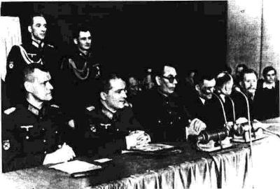 Сидят, слева направо члены КОНР: начальник штаба Вооруженных Сил КОНР генерал-майор ВС КОНР Ф.И. Трухин, начальник Главного управления пропаганды КОНР генерал-лейтенант ВС КОНР Г.Н. Жиленков, Председатель КОНР и Главнокомандующий ВС КОНР генерал-лейтенант ВС КОНР А.А. Власов, начальник Главного организационного управления генерал-майор ВС КОНР В.Ф. Малышкин и др. Стоят, слева направо: оперативные адъютанты генерал-лейтенанта А.А. Власова: начальник командного отдела штаба ВС КОНР полковник ВС КОНР В.В. Поздняков и полковник ВС КОНР И.К. Сахаров. Берлин, отель «Европахаус», 18 ноября 1944 г.