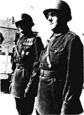 Слева направо: помощник коменданта центрального штаба Абвергруппы-203 (Русской Национальной Народной Армии) полковник И.К. Сахаров, политический руководитель подразделения в форме генерал-лейтенанта Г.Н. Жиленков. Осинторф, Смоленская область, 1942 г.