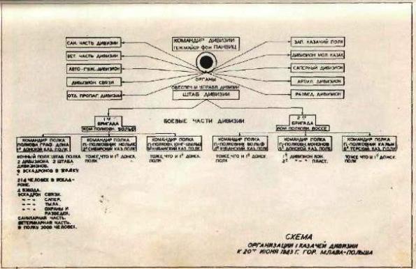 Командирами дивизионов были назначены также немецкие офицеры и лишь на должности командиров сотен (эскадронов), взводов и отделений был назначен некоторый процент казачьих офицеров и под-офицеров.
