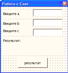 Все переменные вводятся в текстовые поля формы. При нажатии на кнопку «Результат» происходят выбор действия и вывод полученного значения в специальную метку формы.