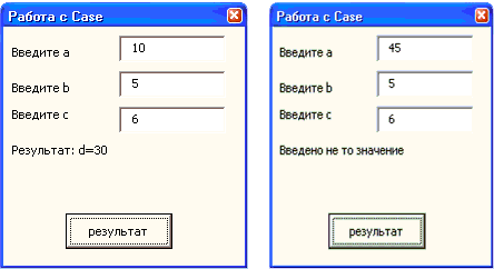 Если программа в итоге выдает значение одного типа (числовое или строковое), то строку вывода результата можно прописывать по окончании всего блока Case. В данном примере сначала выводятся числовые значения (d), а затем строковое («Введено не то значение»). Поэтому вывод результата необходимо предусмотреть в каждой ветке Case.